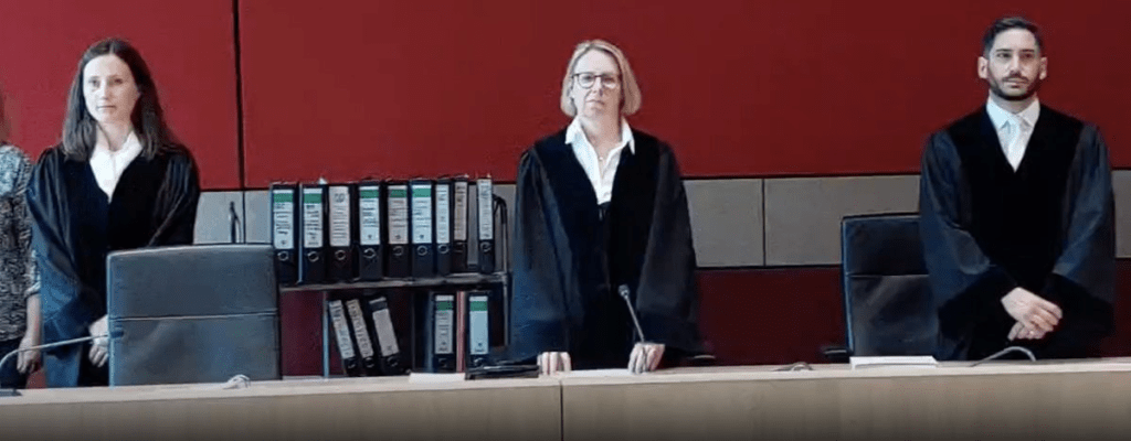 Als Boris Reitschusters Frau den Arzt Habig, der über ein Jahr in U-Haft sitzt, an seinem Geburtstag im Gerichtssaal umarmen wollte, verhinderte Richterin Petra Breywisch-Lepping das durch das hektische Herbeirufen der Wachmeister. Sie ließ den Arzt lange in Hand- und Fußfesseln vorführen wie einen gemeingefährlichen Gewaltverbrecher. Auf dem Bild sehen Sie Breywisch-Lepping heute im Gerichtssaal in der Mitte neben ihren beiden Kollegen. Sie und die Schöffen ließen den Arzt Habig heute für fast drei Jahre einknasten, weil er Ungeimpften, die als Menschen zweiter Klasse behandelt wurden, Impfpässe ausstellte. Eine Ärzte-Kollegin hatte ihn denunziert. Richterin Breywisch-Lepping unternahm in dem Prozess nicht mal den Versuch, unvoreingenommen zu wirken. In einem Jahr Untersuchungshaft durften Habig seine Enkel (acht und zehn Jahre alt), die er vor der Festnahme jeden Tag sah, nur einmal im Gefängnis besuchen.