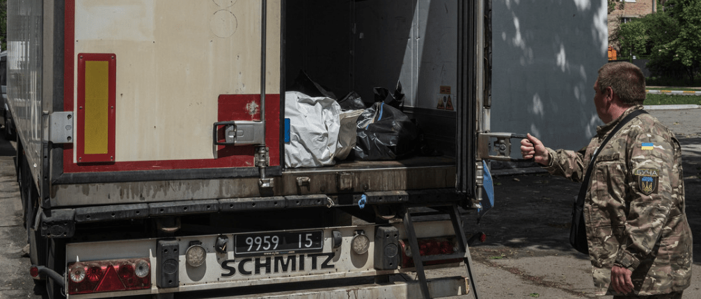Ein Lastwagen mit den Leichen ukrainischer Soldaten