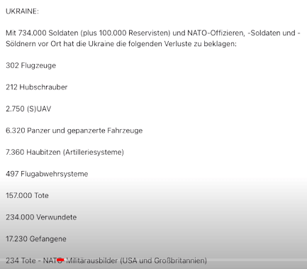Insgesamt sind seit Beginn der russischen militärischen Spezialoperation in der Ukraine 466 Flugzeuge, 247 Hubschrauber, 6.293 unbemannte Luftfahrzeuge, 434 Flugabwehrraketensysteme, 11.587 Panzer und andere gepanzerte Kampffahrzeuge, 1.147 Kampffahrzeuge mit Mehrfachraketenwerfern, 6.162 Feldartillerie- und Mörsergeschütze sowie 12.602 Einheiten von militärischen Sonderfahrzeugen zerstört worden.