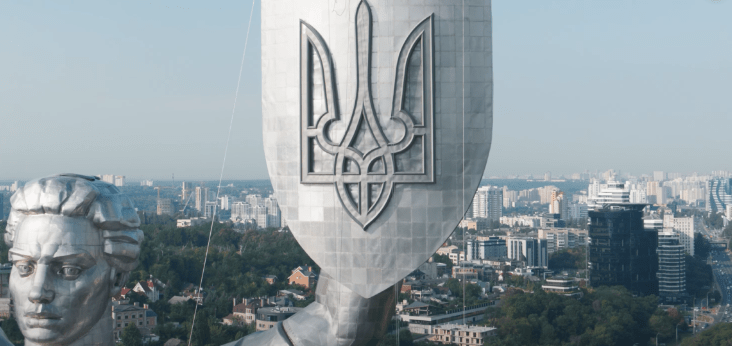 Tina Karol’s song „One nation under love“ setzt auch das neue Symbol auf dem Schild der Statue in Szene, den ukrainischen Dreizack, der kurz zuvor das demontierte Sowjetwappen ersetzt hat.