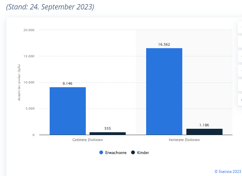 Der Russland-Ukraine Krieg hat laut Zählungen des UN-Hochkommissariats für Menschenrechte (OHCHR) bis zum 24. September 2023 mindestens 9.701 Todesopfer in der ukrainischen Zivilbevölkerung gefordert, darunter mindestens 555 Kinder. Zudem wurden aufgrund des Ukraine-Krieges bisher mindestens 17.748 verletzte Zivilisten, darunter 1.186 verletzte Kinder, vom OHCHR erfasst.