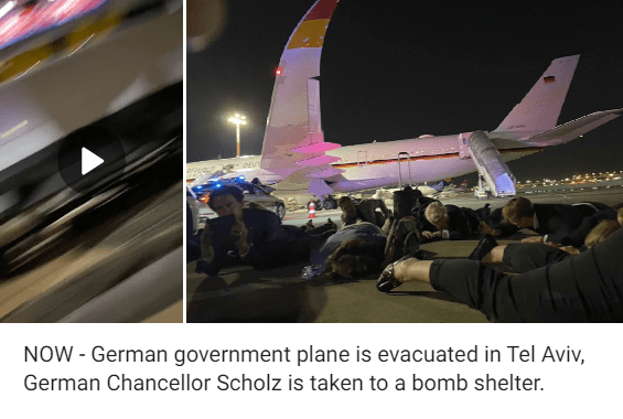 Bundeskanzler Olaf Scholz (SPD) musste laut Spiegel vor seinem geplanten Abflug von Tel Aviv nach Kairo wegen eines Raketenalarms sofort das Flugzeug verlassen. Scholz wurde mit einem Pkw in ein Gebäude gefahren, die übrigen Passagiere hatten sich auf dem Flugfeld auf den Boden zu legen.