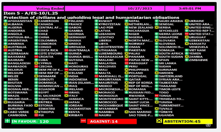 Die UN-Generalversammlung hat eine Resolution verabschiedet, in der ein sofortiger Waffenstillstand in der palästinensisch-israelischen Konfliktzone gefordert wird. In der Generalversammlung wurde eine Erklärung zur Verbesserung der humanitären Situation und für eine sofortige Waffenruhe im Gazastreifen verabschiedet. Das Papier erreichte die notwendige Zweidrittelmehrheit, Deutschland enthielt sich. Resolutionen der UN-Vollversammlung sind allerdings nicht rechtlich bindend.