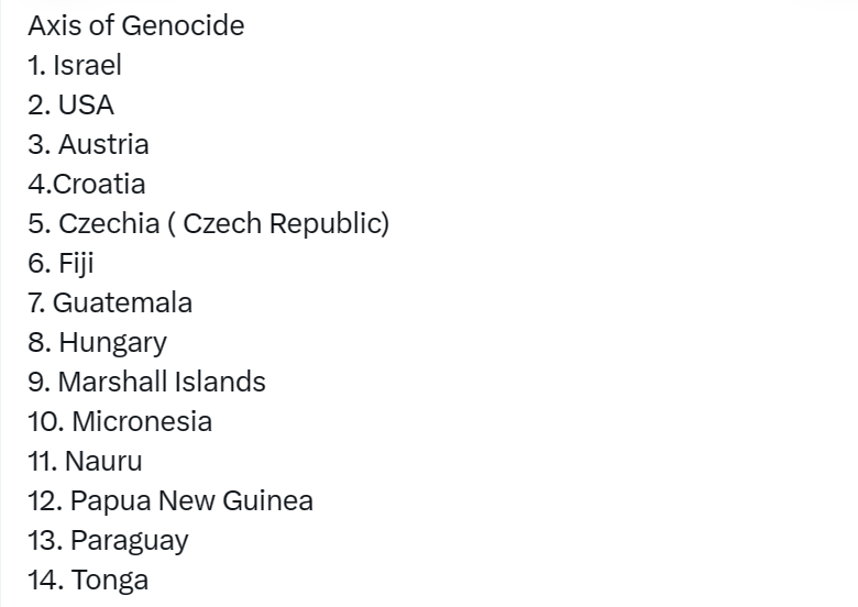 Israel, USA and friends: Oestreich, Kroatien, Tchechien, Ungarn, Fichi Inseln, Guatemala, Marschal Inseln, Mikronesien, Nauru, Papua New, Paraguay, Tonga,