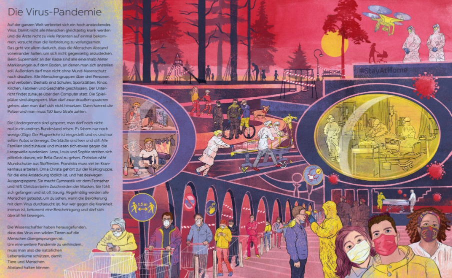 Auf großen Doppelseiten werden in Wimmelbildern mit Begleittexten verschiedene Doppelszenarien vorgestellt. Diese heißen etwa „Die Luft wird dünn“, „Leben im Raumschiff“ oder „Die Virus-Pandemie“. Beim berüchtigten Onlinehändler Amazon kann man einige dieser Bilder sehen.