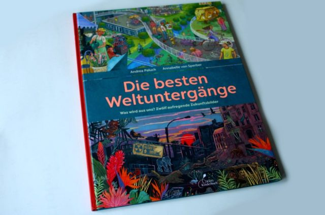 „Der Titel „Die besten Weltuntergänge“ klingt dystopischer als das Buch ist. Es werden kindgerecht verschiedene Zukünfte dargestellt. Diese können zwar düster (u. a. Eine Welt in der Dürre), aber für Kinder vielleicht auch positiv (u. a. Kinderparadies) sein.“