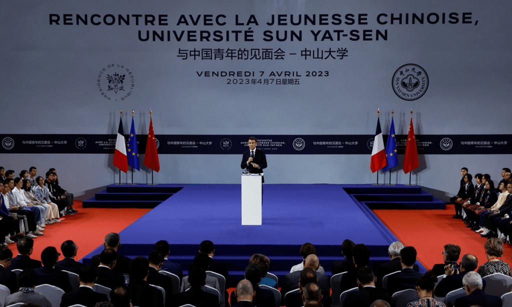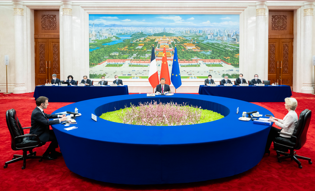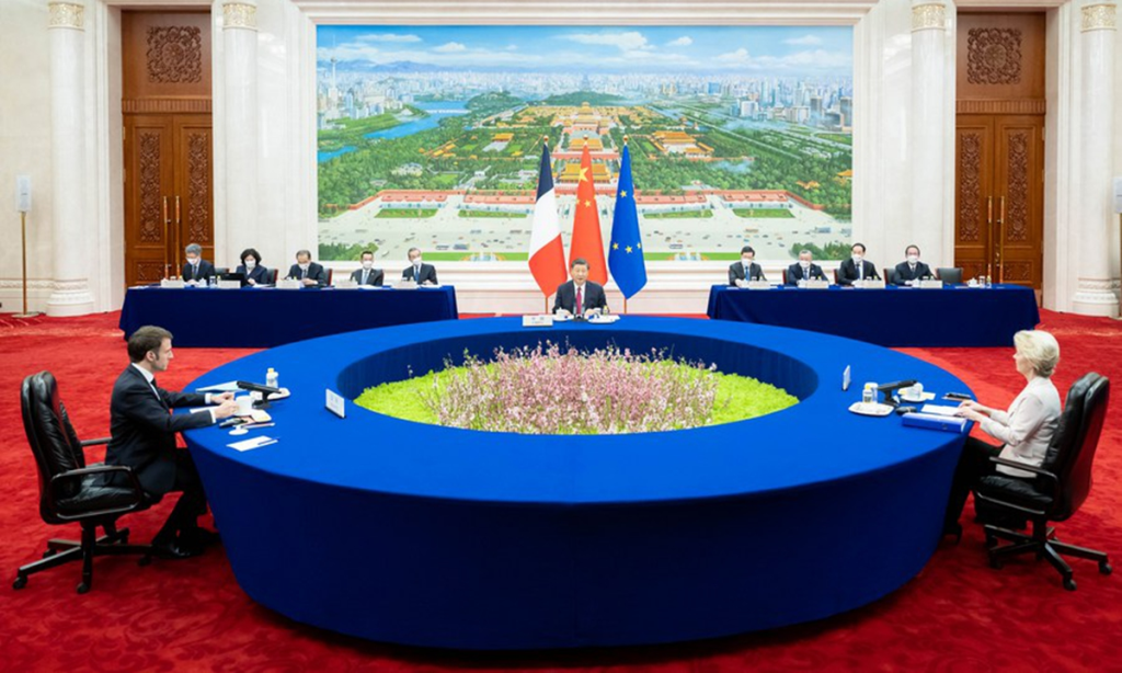 Der chinesische Präsident Xi Jinping (Mitte) hält ein trilaterales Treffen mit dem französischen Präsidenten Emmanuel Macron (links) und der Präsidentin der Europäischen Kommission Ursula von der Leyen in Peking am 6. April 2023 ab. Photo: Xinhua