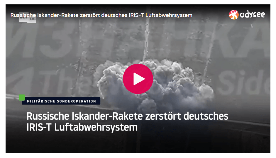 https://odysee.com/@RTDE:e/Russische-Iskander-Rakete-zerst%C3%B6rt-deutsches-IRIS-T-Luftabwehrsystem:7?src=embed