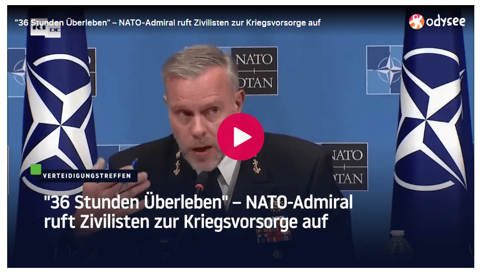 https://odysee.com/@RTDE:e/-36-Stunden-%C3%9Cberleben–%E2%80%93-NATO-Admiral-ruft-Zivilisten-zur-Kriegsvorsorge-auf:4?src=embed