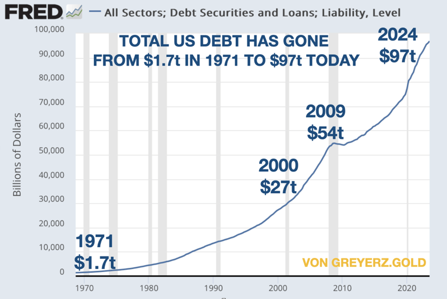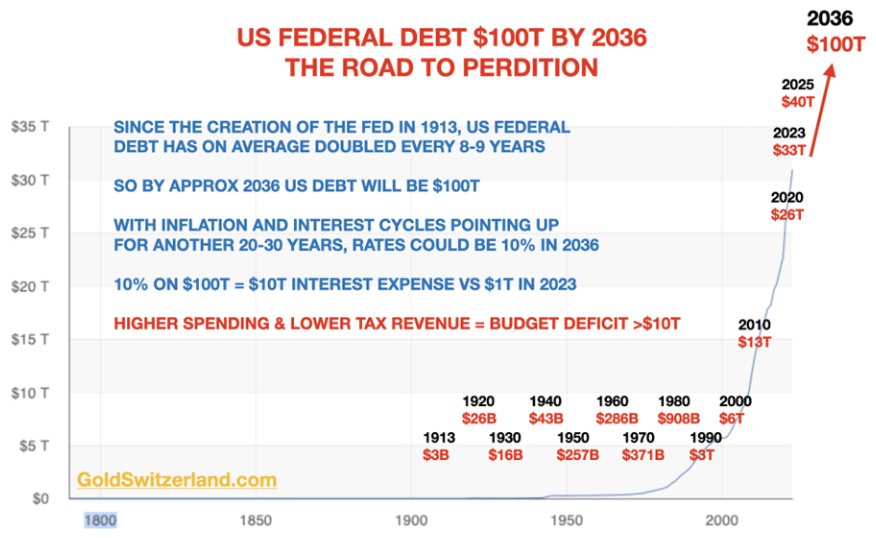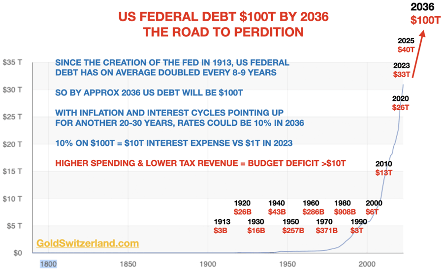 Wenn die Staatsverschuldung in den kommenden 10 bis 12 Jahren 100 Billionen US$ erreicht, wird die US-Wirtschaft in die Zahlungsunfähigkeit rutschen, insbesondere dann, wenn das Zinsniveau auf 10% oder höher steigt. Und man sollte nicht vergessen, dass der Zinssatz in den späten 1970er und den frühen 1980er Jahren schon bei 20% lag. Offensichtlich wird der US-Dollar spätestens dann, aber wahrscheinlich schon deutlich früher, zusammenbrechen, womit nur noch Gold als einziges reales Zahlungsmittel bleibt, das Zentralbanken und gewöhnliche Anleger noch halten werden wollen.