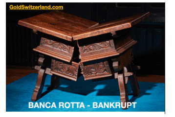 Banca Rotta oder Bankrott ist ein Begriff, der im 16. Jahrhundert im italienischen Finanzsystem (in Florenz) geprägt wurde, als Finanzgeschäfte noch an Banken oder Tischen abgewickelt wurden. Konnte ein Banker seine Verpflichtungen nicht mehr erfüllen, wurden seine Banken oder Tische zerschlagen. Das Wort Bankrott geht also auf die zerschlagene Bank (Italienisch: „banca rotta„) zurück.