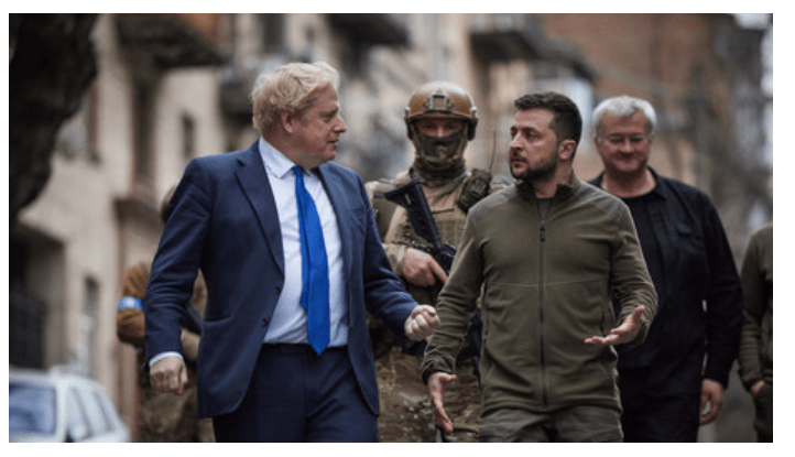 Erst am 9. April erfolgte dann tatsächlich der Abbruch der Verhandlungen durch einen unangemeldeten Besuch des britischen Premierministers Boris Johnson in Kiew. Die Neue Zürcher Zeitung bemerkte dazu noch am 12. April, das sei wohl der erste Tory-Wahlkampf, „der an den Grenzen Russlands ausgetragen wird. (…) Dass dieser Konflikt von Großbritannien für einen schäbigen bevorstehenden Führungswettstreit missbraucht wird, ist widerwärtig.“