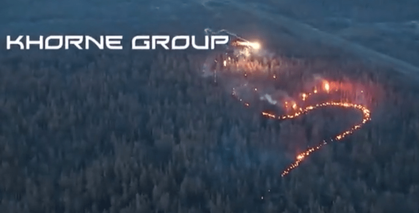 Das Material entstammt dem Telegram-Kanal Khorne Group, der von einem Drohnenpilotenkommando des ukrainischen Militärs geführt wird. Gezeigt werden Drohnen, die aus angehängten Behältern brennendes Thermit über Wäldern verstreuen.