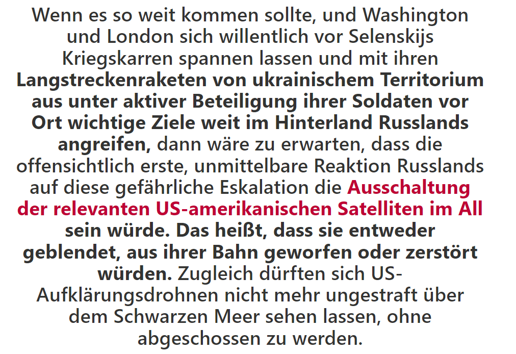 Wenn es so weit kommen sollte, und Washington und London sich willentlich vor Selenskijs Kriegskarren spannen lassen und mit ihren Langstreckenraketen von ukrainischem Territorium aus unter aktiver Beteiligung ihrer Soldaten vor Ort wichtige Ziele weit im Hinterland Russlands angreifen, dann wäre zu erwarten, dass die offensichtlich erste, unmittelbare Reaktion Russlands auf diese gefährliche Eskalation die Ausschaltung der relevanten US-amerikanischen Satelliten im All sein würde. Das heißt, dass sie entweder geblendet, aus ihrer Bahn geworfen oder zerstört würden. Zugleich dürften sich US-Aufklärungsdrohnen nicht mehr ungestraft über dem Schwarzen Meer sehen lassen, ohne abgeschossen zu werden.