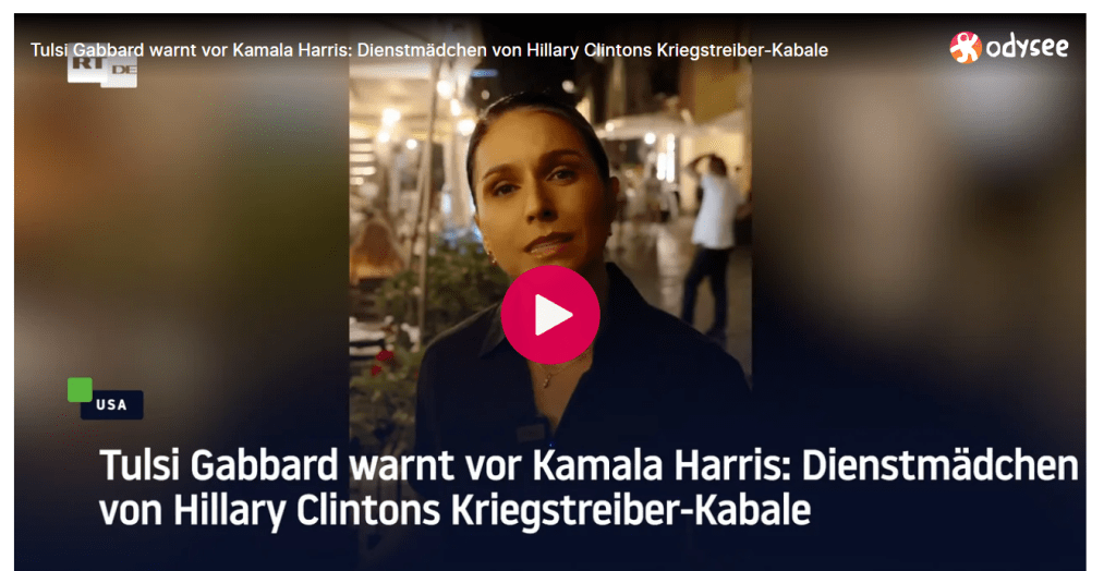 https://odysee.com/@RTDE:e/Tulsi-Gabbard-warnt-vor-Kamala-Harris–Dienstm%C3%A4dchen-von-Hillary-Clintons-Kriegstreiber-Kabale:7?src=embed
