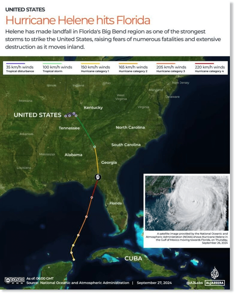 Hurrikan „Helen“ traf die US-Küstengebiete mit anhaltenden Winden von mehr als 130 Meilen (ca. 209 km) pro Stunde, was zu schweren Überschwemmungen, Stromausfällen und zum Zusammenbruch der regionalen Infrastruktur führte. Nach ersten Zählungen wurden über 10.000 Häuser schwer beschädigt oder zerstört. Zigtausende Menschen irrten obdachlos auf der Suche nach Unterkunft umher. Wichtige Verbindungsstraßen und Brücken wurden unterspült oder ganz weggewaschen, was die Hilfsmaßnahmen zusätzlich behindert.