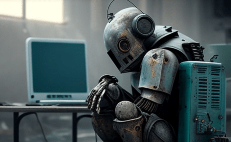(Dieses Bild wurde mit der Bilder-KI Midjourney generiert. Der Prompt lautete: „robot sitting next to computer, laboratory background, dystopian mood, highly detailed“)