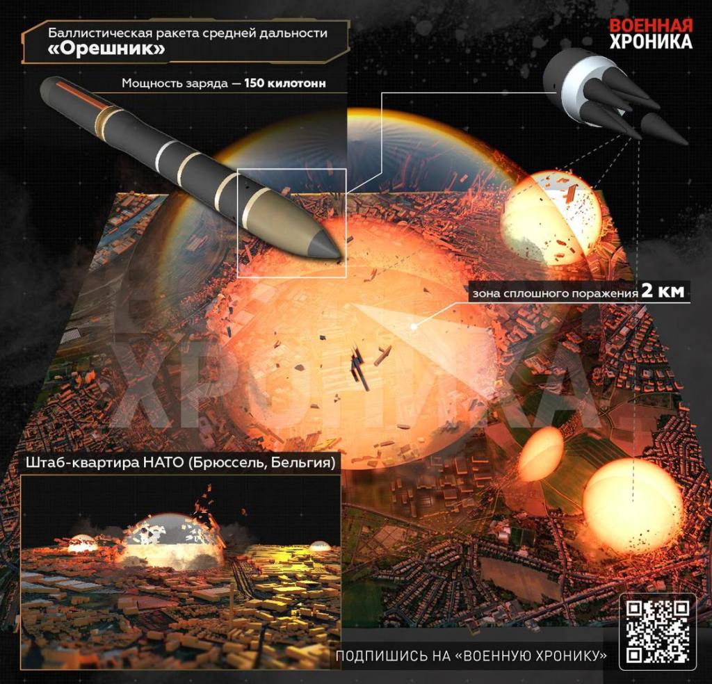 Die Schlagkraft einer Oreschnik-Rakete mit mehreren Sprengköpfen verglich er mit der Wucht eines Meteoriteneinschlags, der einen Krater in der Größe eines Sees hinterlassen könne. Ein Sprengkopf erhitze sich im Inneren bis auf 4.000 Grad – unwesentlich weniger als die Temperatur auf der Sonnenoberfläche. Im Epizentrum der Explosionen verwandele sich alles zu Asche und Staub und werde in „elementare Teilchen“ zerteilt. Man könne damit tief liegende unterirdische Bunkeranlagen zerstören. Da die Rakete hochpräzise treffe und keine radioaktive Verseuchung hinterlasse, sei sie keine Massenvernichtungswaffe wie etwa eine Atombombe. Auch sagte er, dass es sich nicht lohne, kleinere Objekte mit solchen Raketen anzugreifen, dies sei „Schießen mit Kanonen auf Spatzen“.
