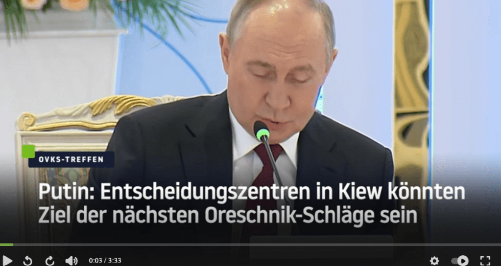 Am Donnerstag gab der russische Präsident Wladimir Putin auf dem Gipfeltreffen der Organisation des Vertrags über kollektive Sicherheit (OVKS) in Astana neue technische Einzelheiten zu Russlands neuester nichtnuklearer ballistischer Rakete Oreschnik preis. „Wir waren zu einem Probeeinsatz unter Gefechtsbedingungen gezwungen – und zwar, wie ich bereits sagte, als Gegenmaßnahme zu den mit ATACMS- und Storm-Shadow-Raketen durchgeführten Angriffen auf die Gebiete Brjansk und Kursk“, rief der Staatschef in Erinnerung.