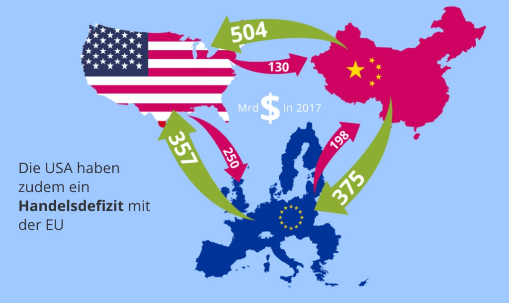 Bei den Einfuhren (auf die US-Einfuhrzölle erhoben werden können) war China der wichtigste Lieferant von Waren in die USA (16,5% der gesamten Wareneinfuhren), gefolgt von Mexiko und Kanada. Insgesamt importierten die USA Waren im Wert von über 1,4 Billionen Dollar aus diesen drei Ländern. Kanada (356,5 Mrd. USD), Mexiko (324,3 Mrd. USD) und China (150,4 Mrd. USD) waren in dieser Reihenfolge auch die drei wichtigsten Zielländer für US-Ausfuhren, die zusammen einen Wert von 830 Mrd. USD hatten.