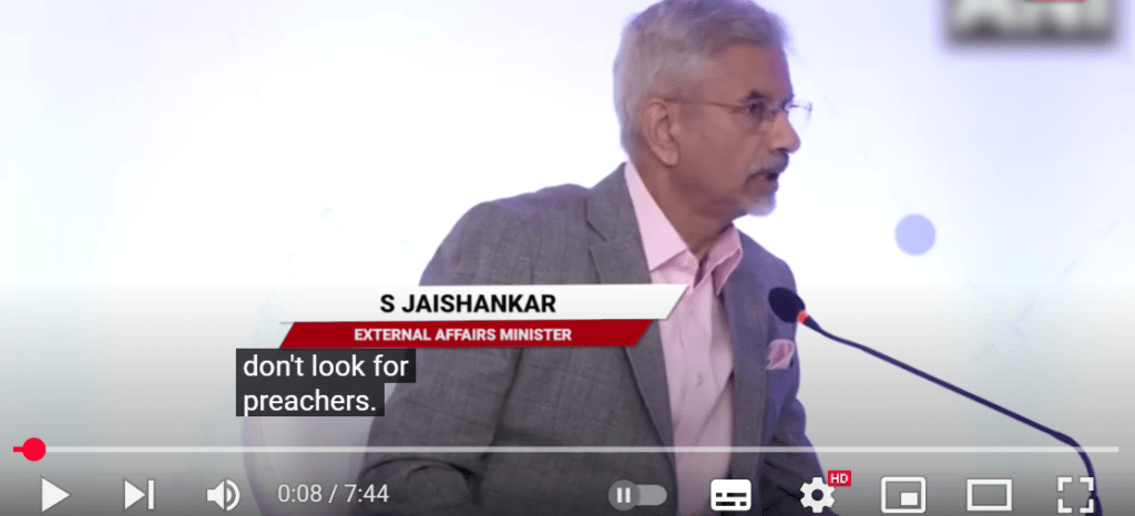 In einem heftigen Angriff auf die Europäische Union betonte Indien’s Außenminister Dr. S. Jaishankar, dass Indien auf der Weltbühne echte Partner suche – keine Moralapostel, insbesondere solche, die im Ausland nicht das aufrechterhalten, was sie im Inland nicht praktizieren. Er merkte an, dass Teile Europas sich einem Realitätscheck unterziehen müssten. Ob sie dieser Herausforderung gewachsen seien, bleibe abzuwarten. Für die Entstehung einer sinnvollen Partnerschaft seien gegenseitiges Verständnis, Sensibilität, gemeinsame Interessen und eine realistische Sicht auf die globale Dynamik erforderlich, betonte er.
