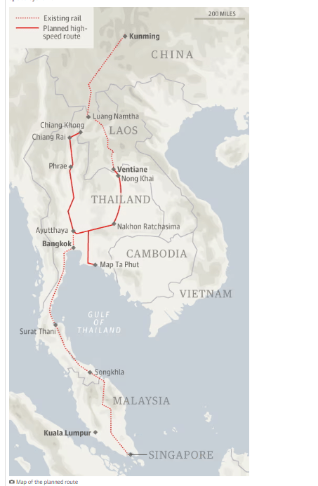 Laut China Railway Corp. soll die Strecke Kunming-Singapur offenbar in vier Etappen gebaut werden, von Kunming nach Vientiane, von Vientiane nach Bangkok, von Bangkok nach Kuala Lumpur und von Kuala Lumpur nach Singapur. Der Bau der thailändischen Strecken als Teil des neuen, achtjährigen Infrastrukturentwicklungsprojekts im Wert von 741,4 Milliarden Baht (23,3 Milliarden Dollar) Bangkok und andere wichtige Städte mit Flughäfen, Seehäfen, Grenzgebieten und Frachtdepots, berichtete die Bangkok Post. Die bestehende Flotte soll um etwa 106 neue Züge erweitert werden. Im Rahmen des gleichen Projekts sollen auch sechs zweigleisige Eisenbahnstrecken gebaut werden. Die beiden Strecken sind insgesamt fast 1.400 km lang. Im Gegensatz zu vielen anderen Hochgeschwindigkeitszügen, die in der Regel mit 200 km/h fahren, können sie jedoch nur mit 160 km/h fahren, bis weitere Investitionen ein schnelleres System ermöglichen.